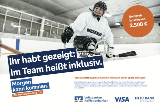 Wir freuen uns über eine besondere Auszeichnung für unsere Arbeit im Bereich Inklusion. Im Rahmen des Vereinswettbewerbs „Visa feiert Inklusion durch Sport. Wir auch!“ wurden wir mit einem Geldpreis in Höhe von 2.500 Euro ausgezeichnet.